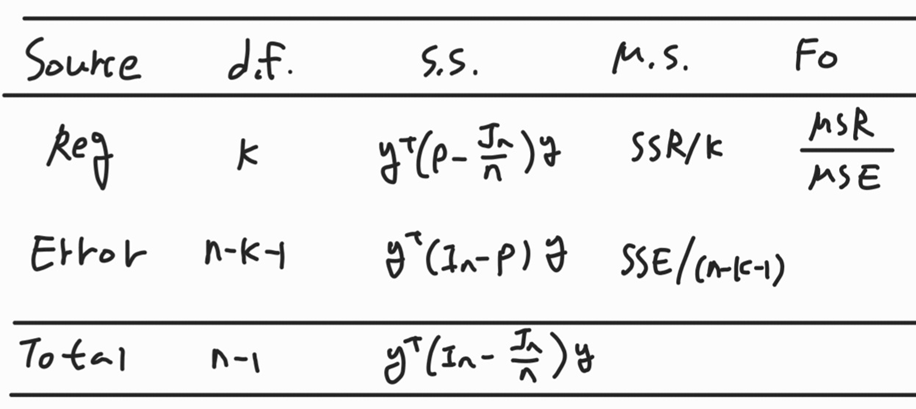 제곱합 공식을 표현하면 다음과 같다.$$SST=\sum_{i=1}^{n}(y_i-\bar{y})^2=y^T(I_n-\frac{J_n}{n})y$$$$SSR=\sum_{i=1}^{n}(\hat{y}_i-\bar{y})^2=y^T(P-\frac{J_n}{n})y$$$$SSE=\sum_{i=1}^{n}(y_i-\hat{y}_i)^2=y^T(I_n-P)y$$이때 Iₙ(항등행렬)과 Jₙ 는