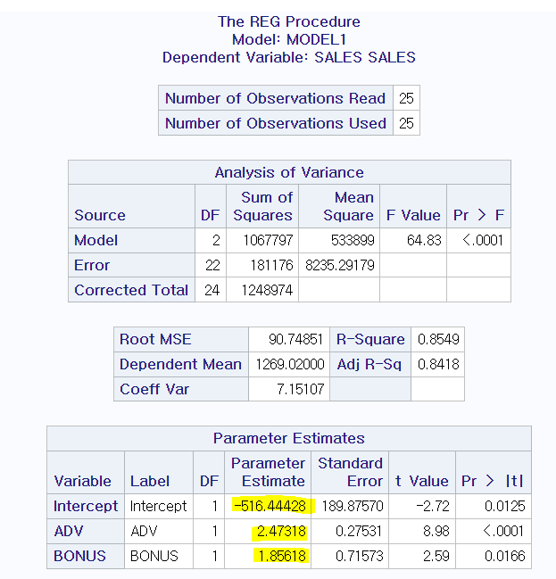 sales_hat = -516.44428 + 2.47318 * adv + 1.85618 * bonus